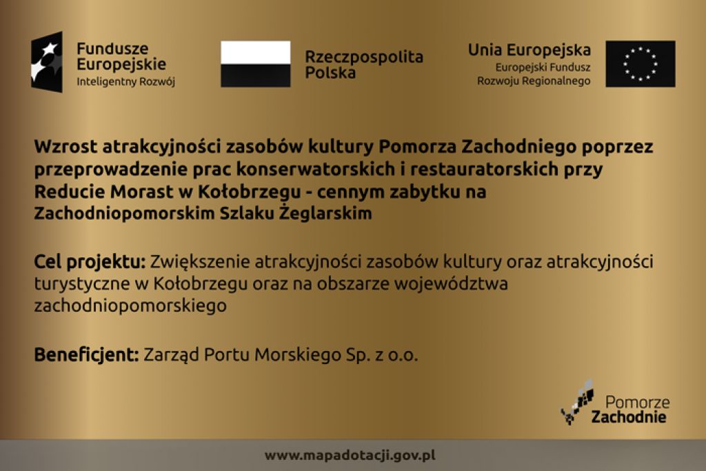 Inwestycja pn. „Wzrost atrakcyjności zasobów kultury Pomorza Zachodniego poprzez przeprowadzenie prac konserwatorskich i restauratorskich przy Reducie Morast w Kołobrzegu – cennym zabytku na Zachodniopomorskim Szlaku Żeglarskim” została współfinansowana przez Unię Europejską z Europejskiego Funduszu Rozwoju Regionalnego w ramach Regionalnego Programu Operacyjnego Województwa Zachodniopomorskiego 2014 – 2020.