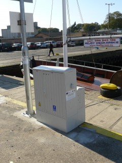 Inwestycja  polegała na odłączeniu kabli zasilających typu YAKY 4×120 (7 sztuk), demontażu istniejących szafek żeliwnych przy Nabrzeżu Wschodnim. W miejscu wyeksploatowanych urządzeń zostały położone nowe kable zasilające typu YAKY 4×120 (7 sztuk) jak również zostały wymienione szafki. Każda z szafek posiada pole liniowe umożliwiające wprowadzenie dwóch kabli typu YAKY 4×120, rozłącznik RBK, trzy pola odbiorcze z zabezpieczeniami i licznikami zużycia energii, zakończone gniazdami 16A – 2 szt., 32A – 1 szt., każde z pól odbiorczych przystosowane są do oddzielnego zamknięcia. Ponadto zostały wykonane prace związane z demontażem oraz z montażem czterech słupów oświetleniowych o długości 9 m. Do nowych słupów zainstalowane są cztery nowe oprawy świetlne na źródło światła metal halogen o mocy 70 W.