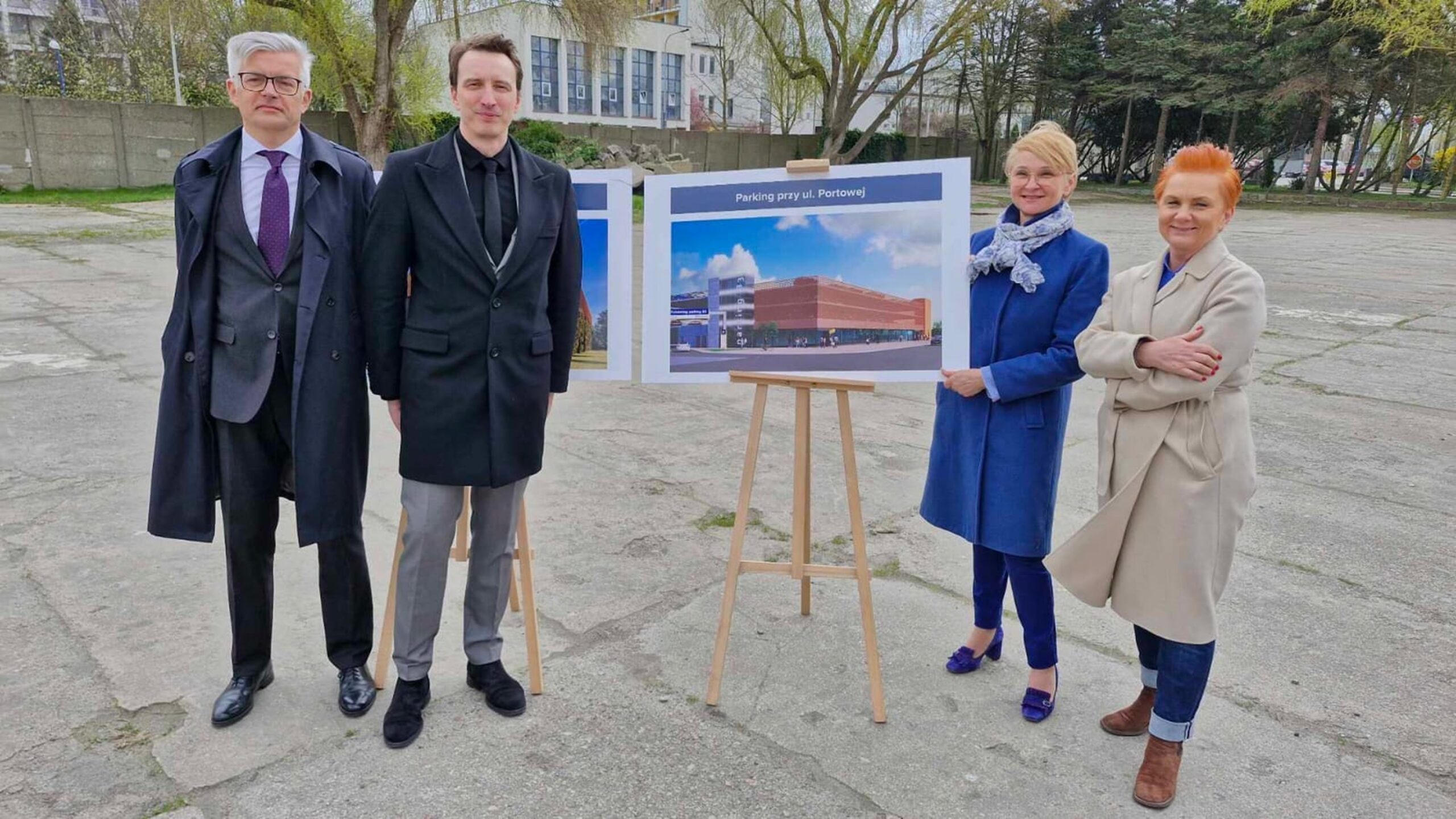 Na zdjęciu od lewej: Maciej Mosiej z firmy Interparking Polska, Artur Lijewski prezes Zarządu Portu Morskiego Kołobrzegu, prezydent Anna Mieczkowska, zastępczyni prezydenta Ewa Pełechata, na terenie portu, gdzie wkrótce powstanie wielopoziomowy parking.